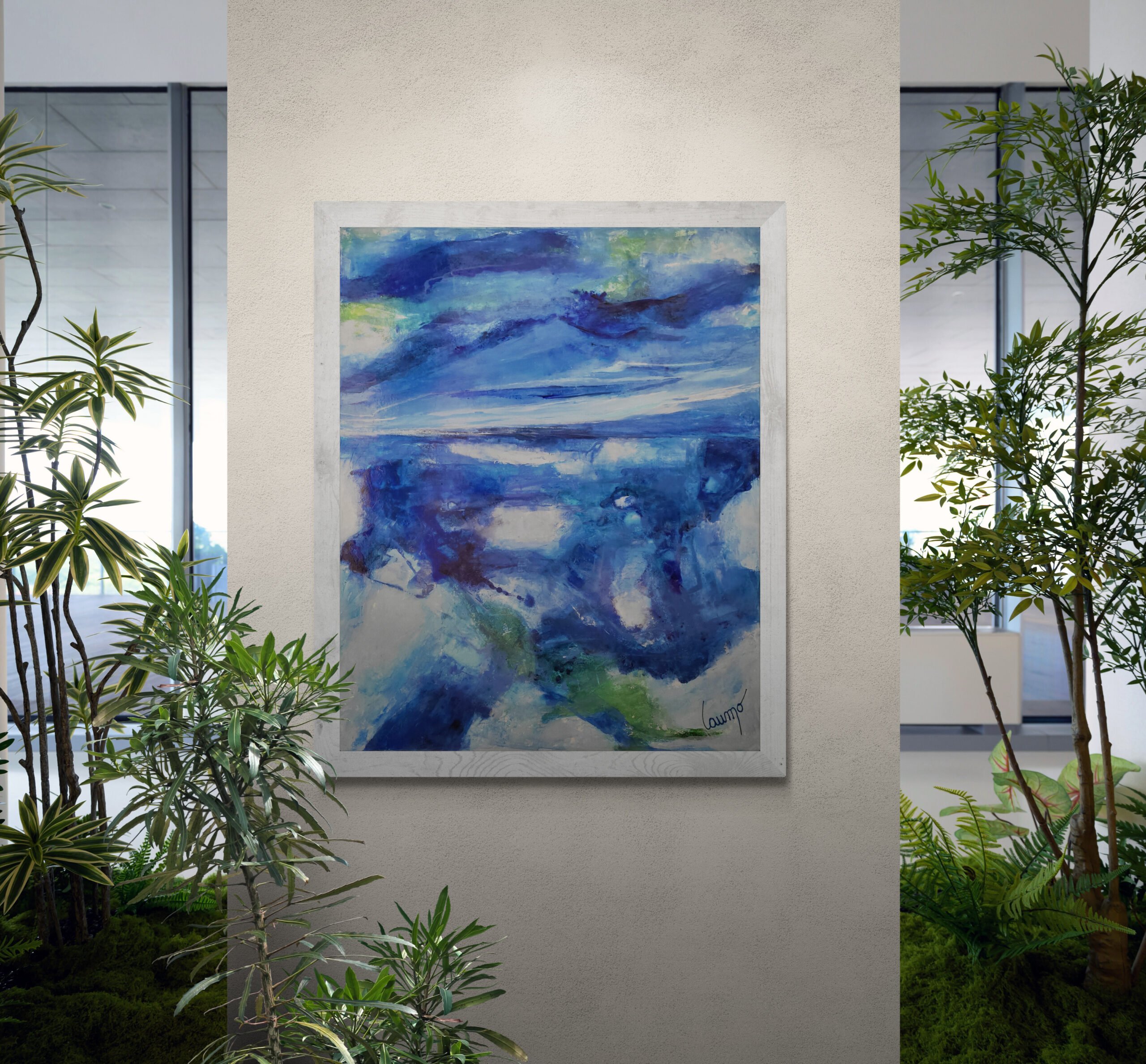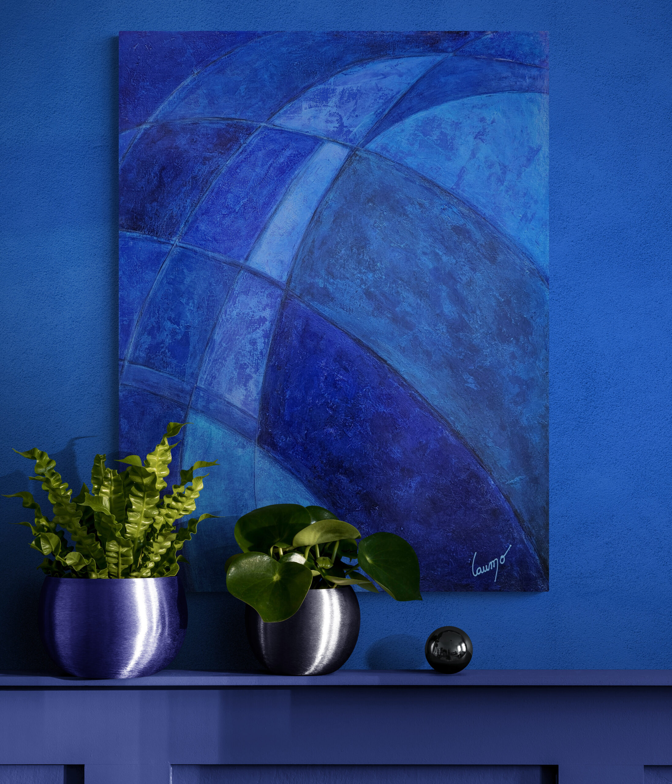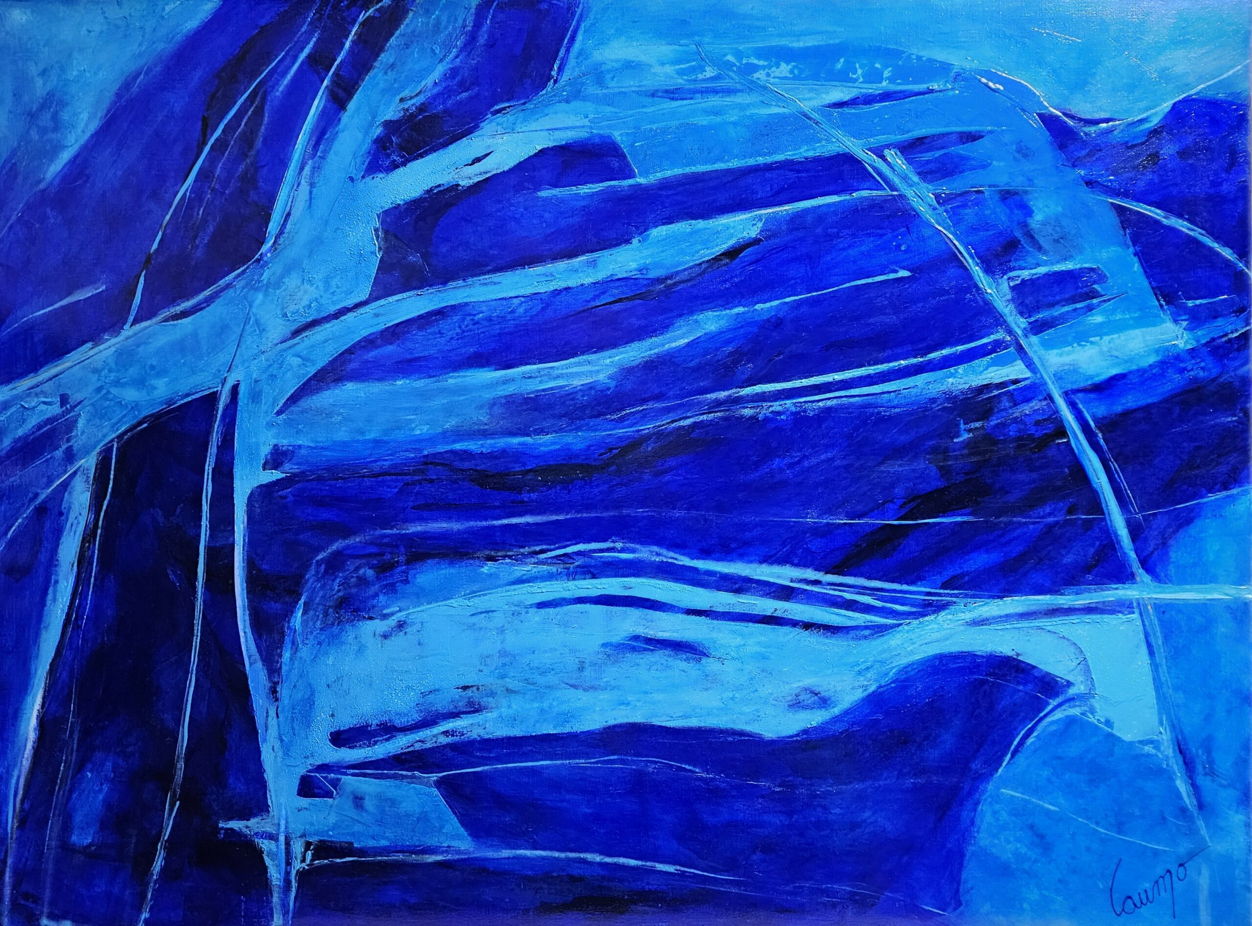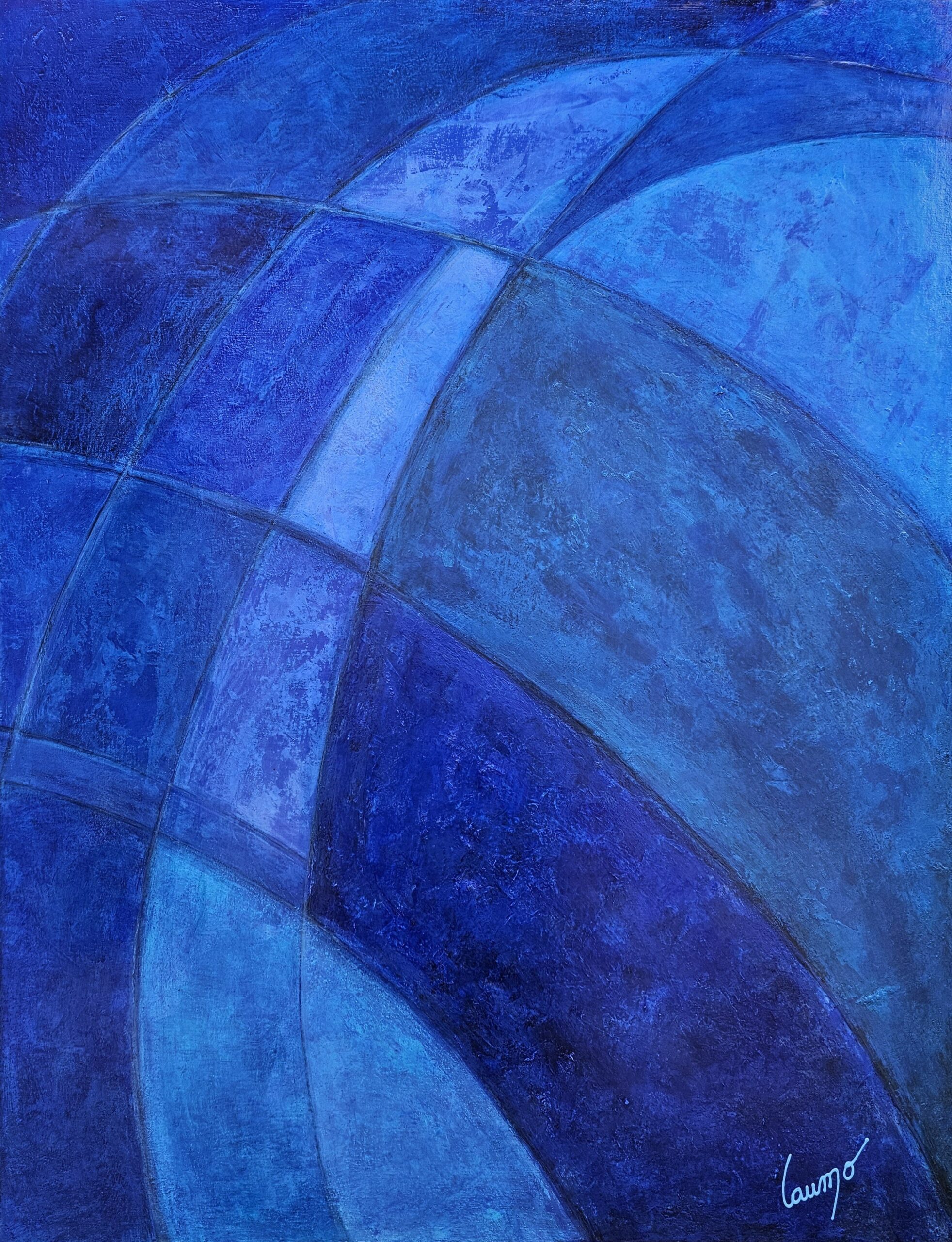 « J’ai voulu créer un tableau où chaque nuance de bleu est un fragment de mémoire, où les teintes se superposent comme des strates de temps, où des émotions enfouies remontent vers la surface afin qu’au cœur de ce bleu multiple, quelque chose se rappelle un horizon perdu, un rêve oublié…, le tableau devenant alors un paysage mental, un mouvement d’âme suspendu parce que chaque teinte révèle une vibration intime. »