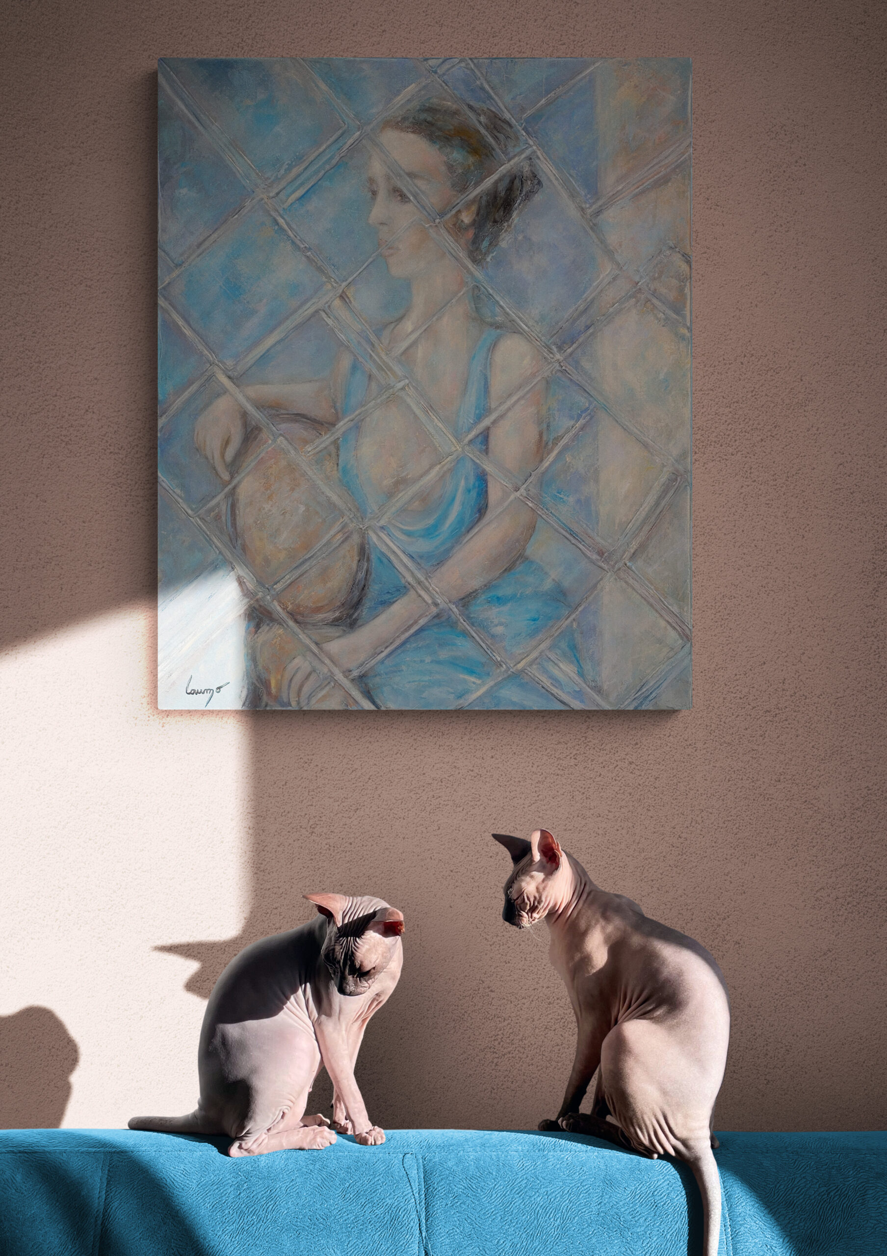 (L’artiste a mis en scène une femme assise reflétée par un miroir dont la particularité repose sur des facettes irrégulières)